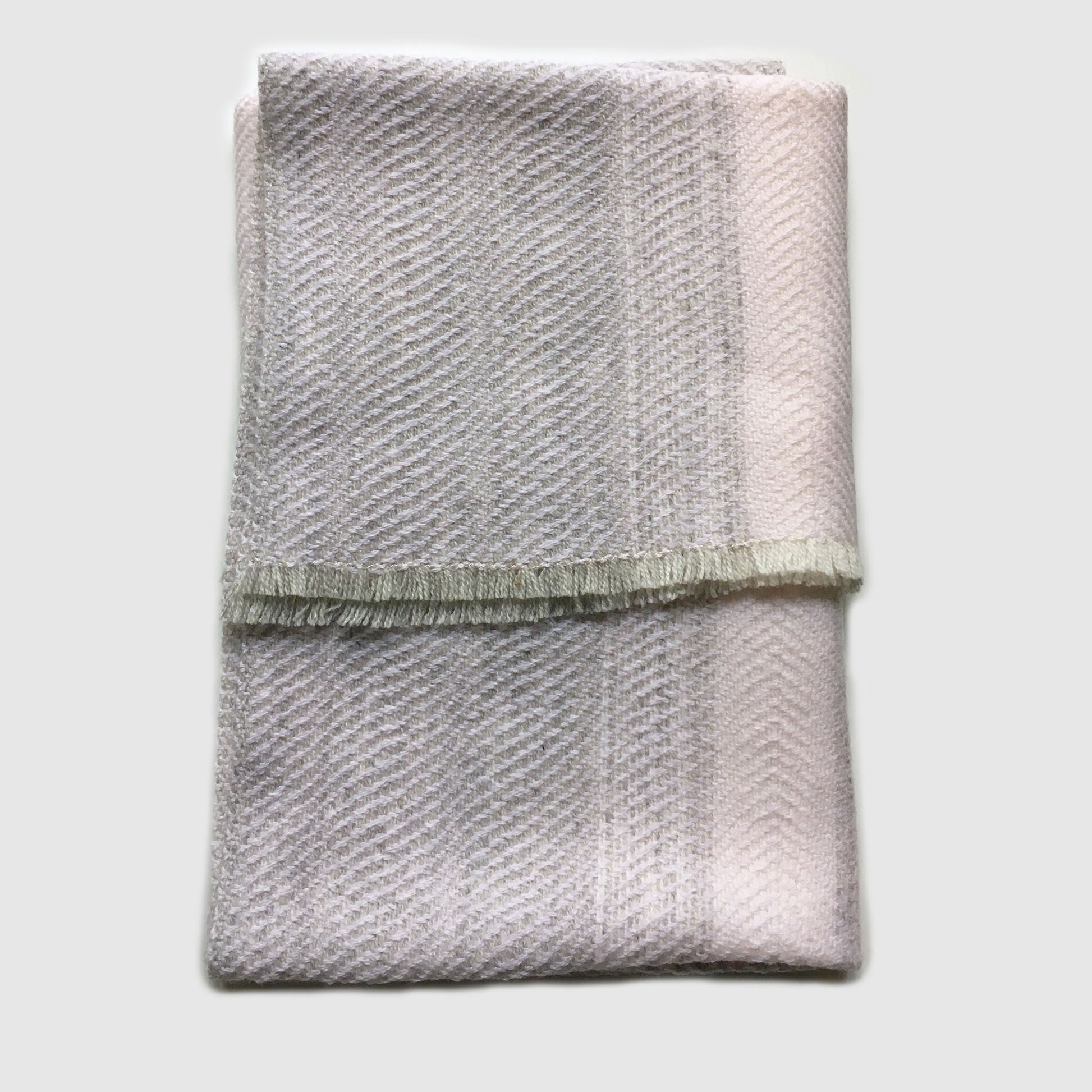 The white, blue, blush & pale grey colours in this piece are reflect streaks of white sparkly quartz found in local rocks, the weave structure is an undulating twill which creates loose fluid lines that mirror flowing lines that occur in nature.