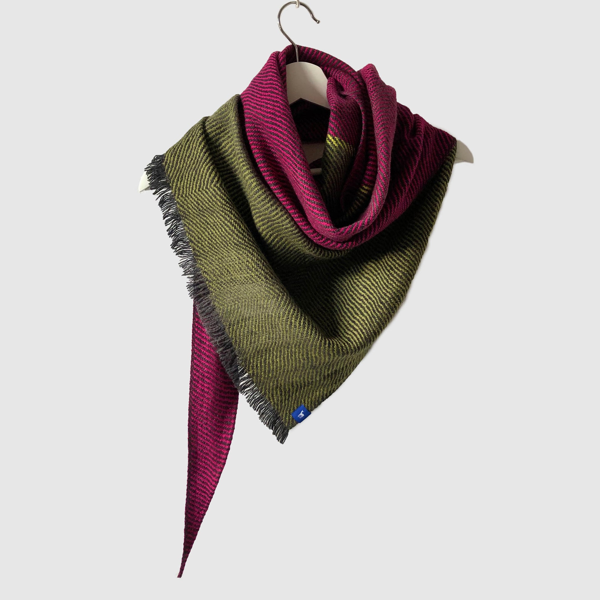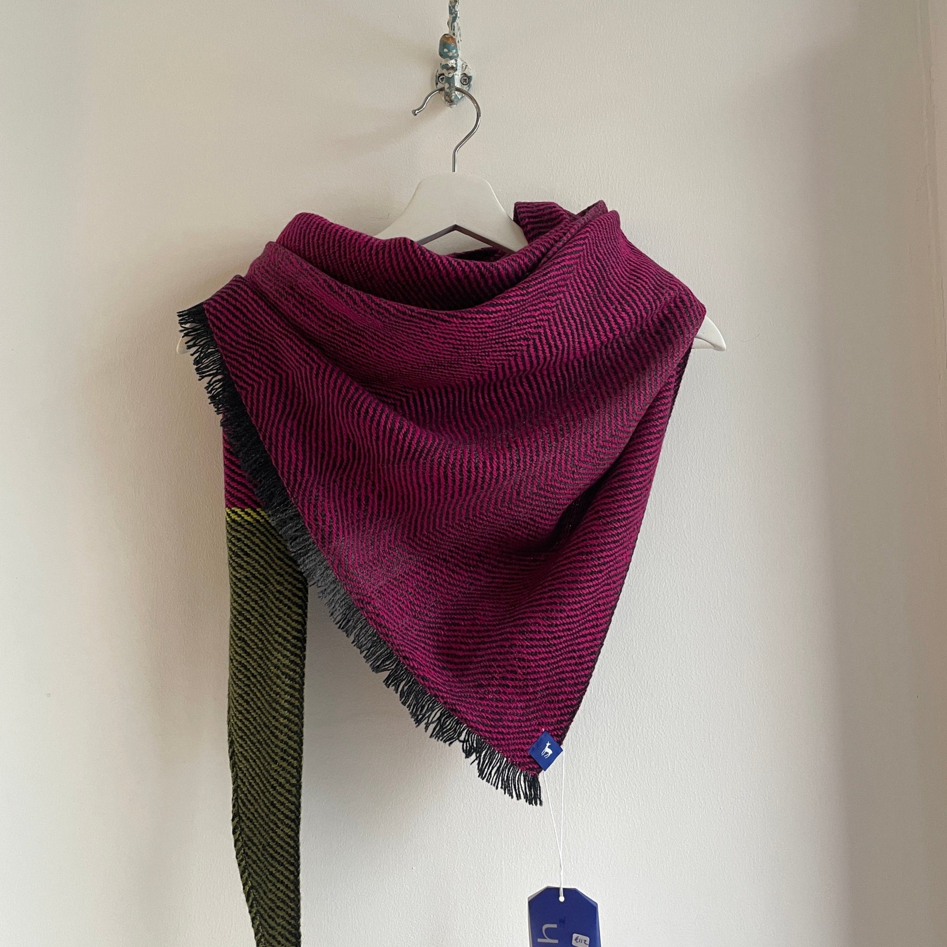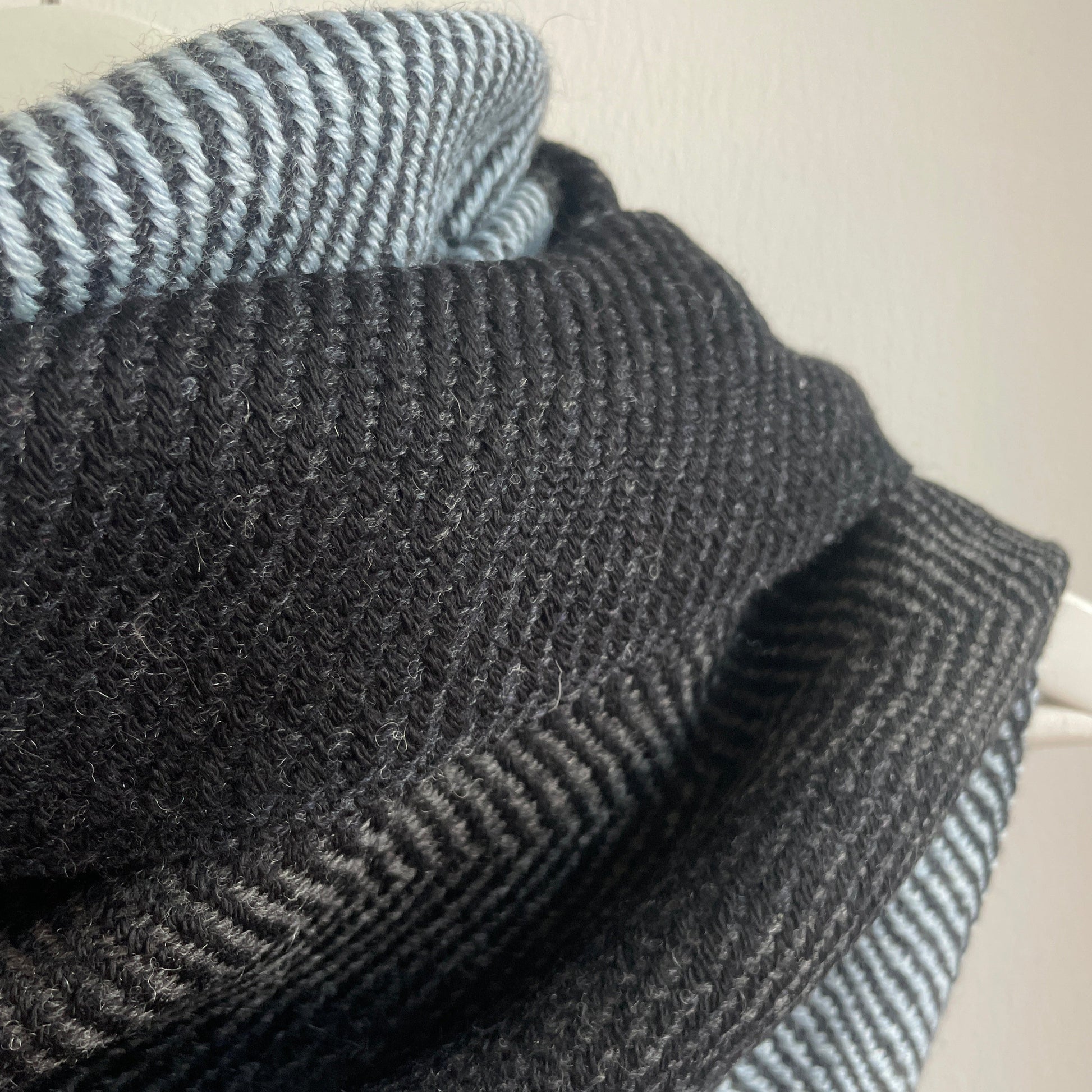 100% Merino (Silky Italian & Lambswool) large triangle scarf inspired by lines and tones in rocks, plants and fish commonly seen along the Slea Head coastline. The weave structure is an undulating twill which creates loose fluid lines that mirror flowing lines that occur in nature. Silky wool woven across dark ombre graduating grey stripes.