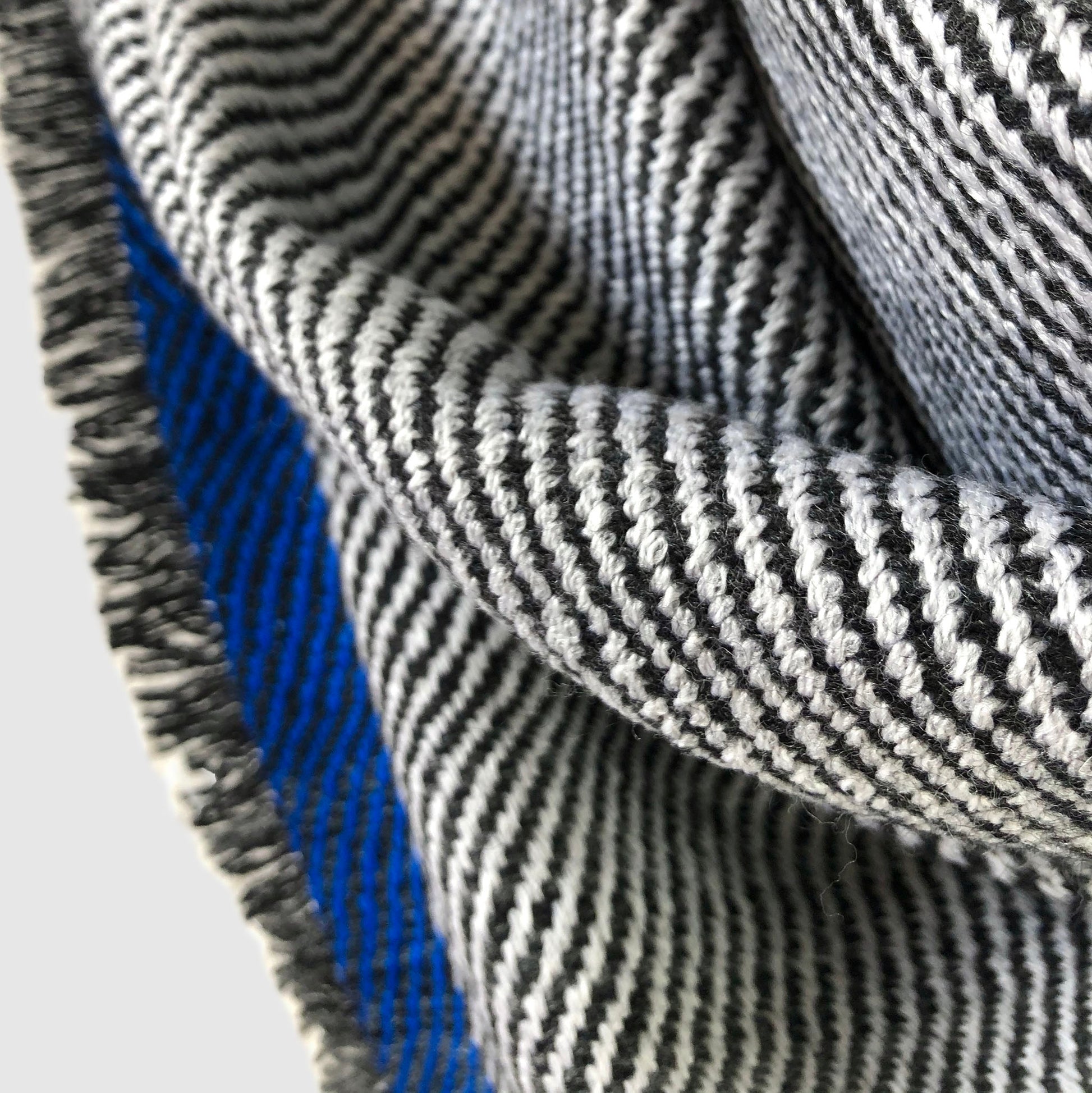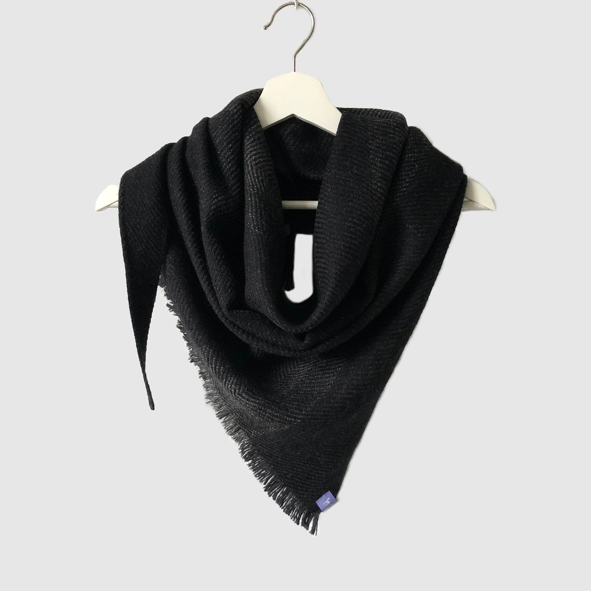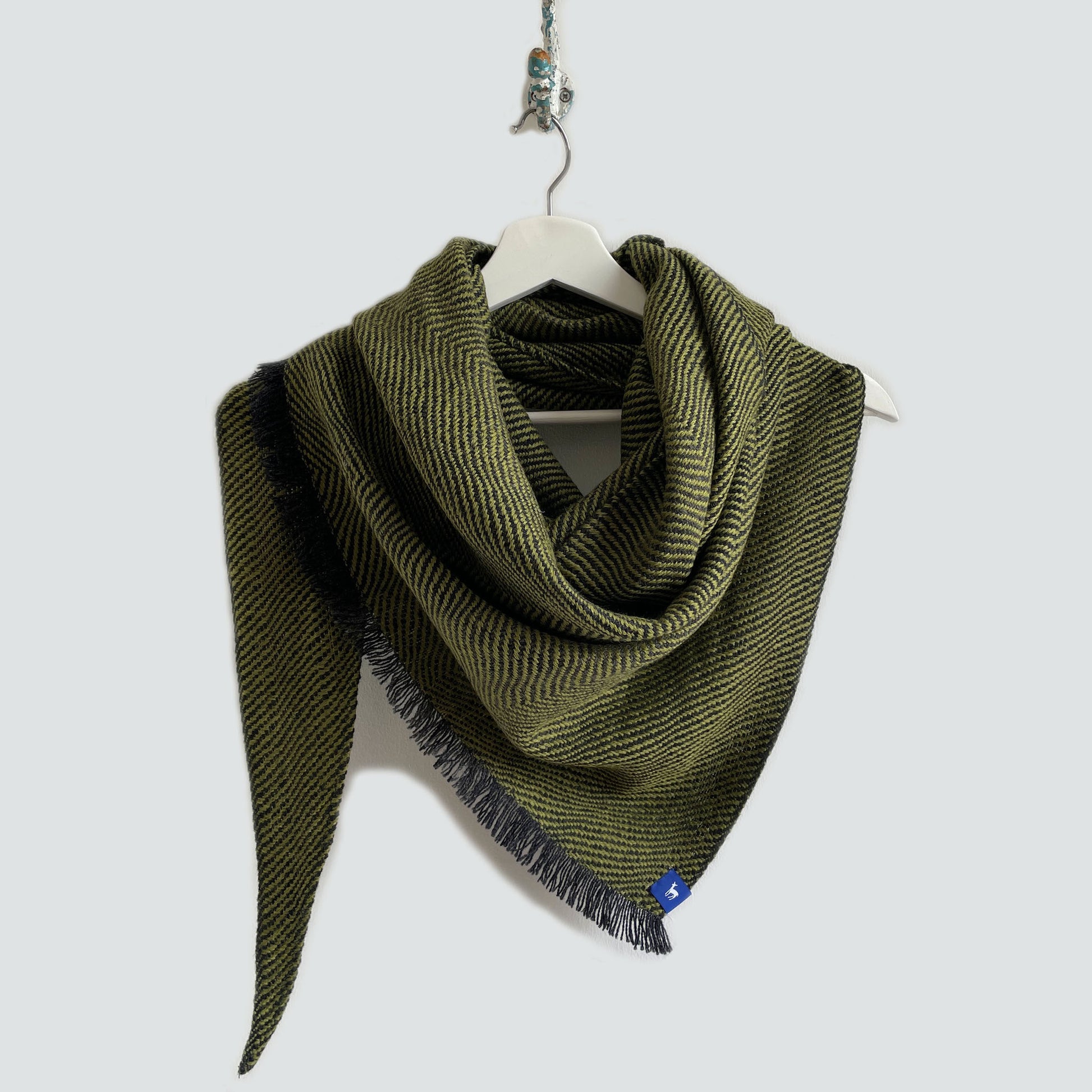 100% Merino (Silky Italian & Lambswool) large triangle scarf inspired by lines and tones in rocks, plants and fish commonly seen along the Slea Head coastline. The weave structure is an undulating twill which creates loose fluid lines that mirror flowing lines that occur in nature. Silky wool woven across dark ombre graduating grey stripes.