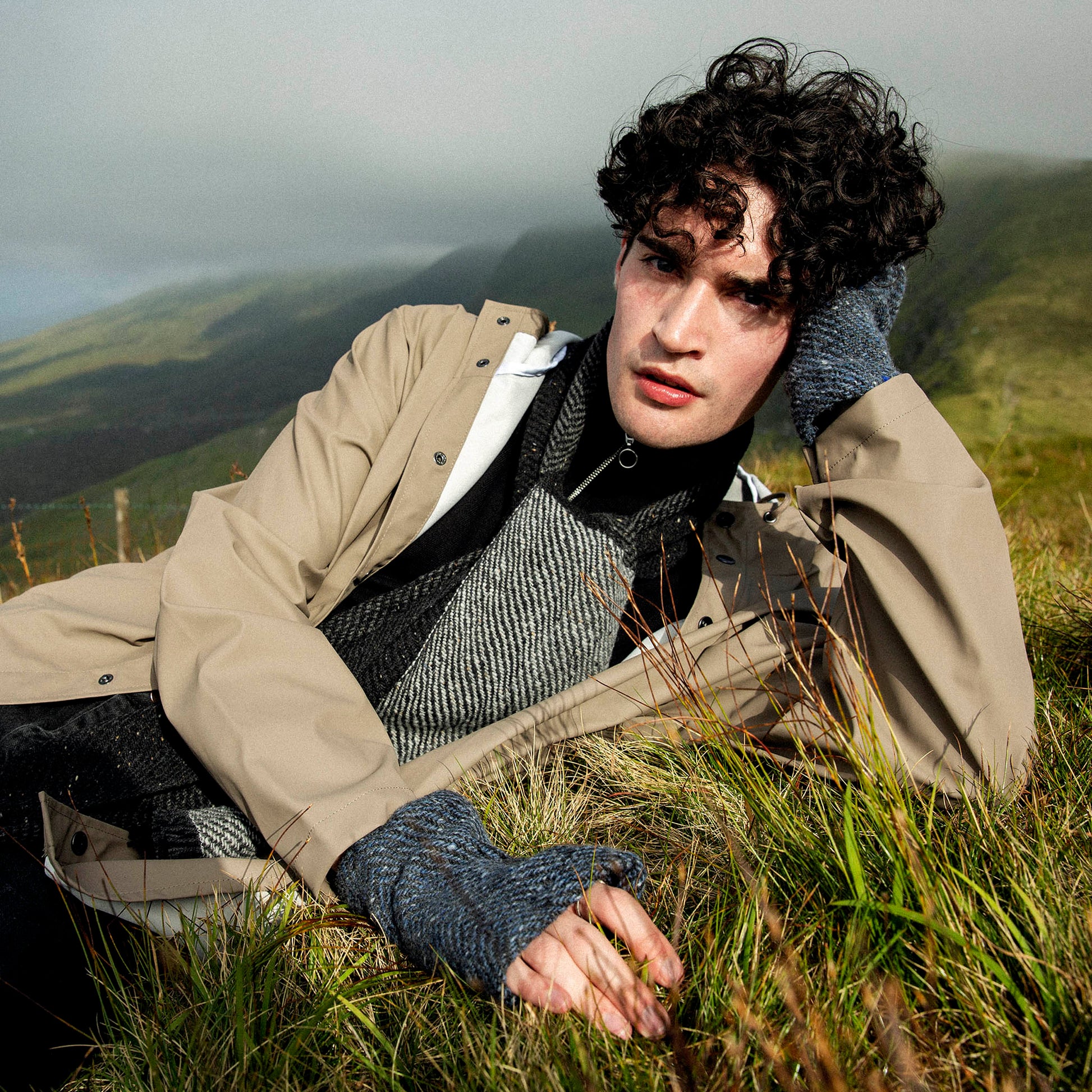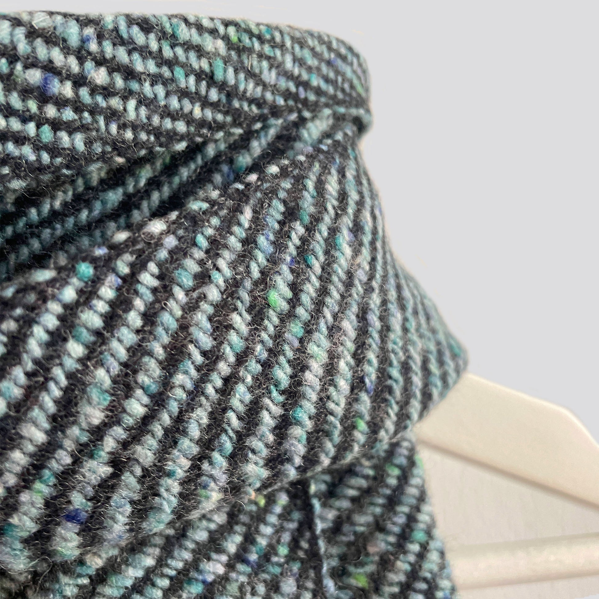 Inspired by lines and tones running through the striking black rocks that run along the Slea Head cliffs, deep teal/green waves, clouds and hills. It is a modern take of traditional tweed fabric and has the look of being roughly textured but is surprisingly super soft. Soft flecked yarn woven across light ombre graduating grey stripes.