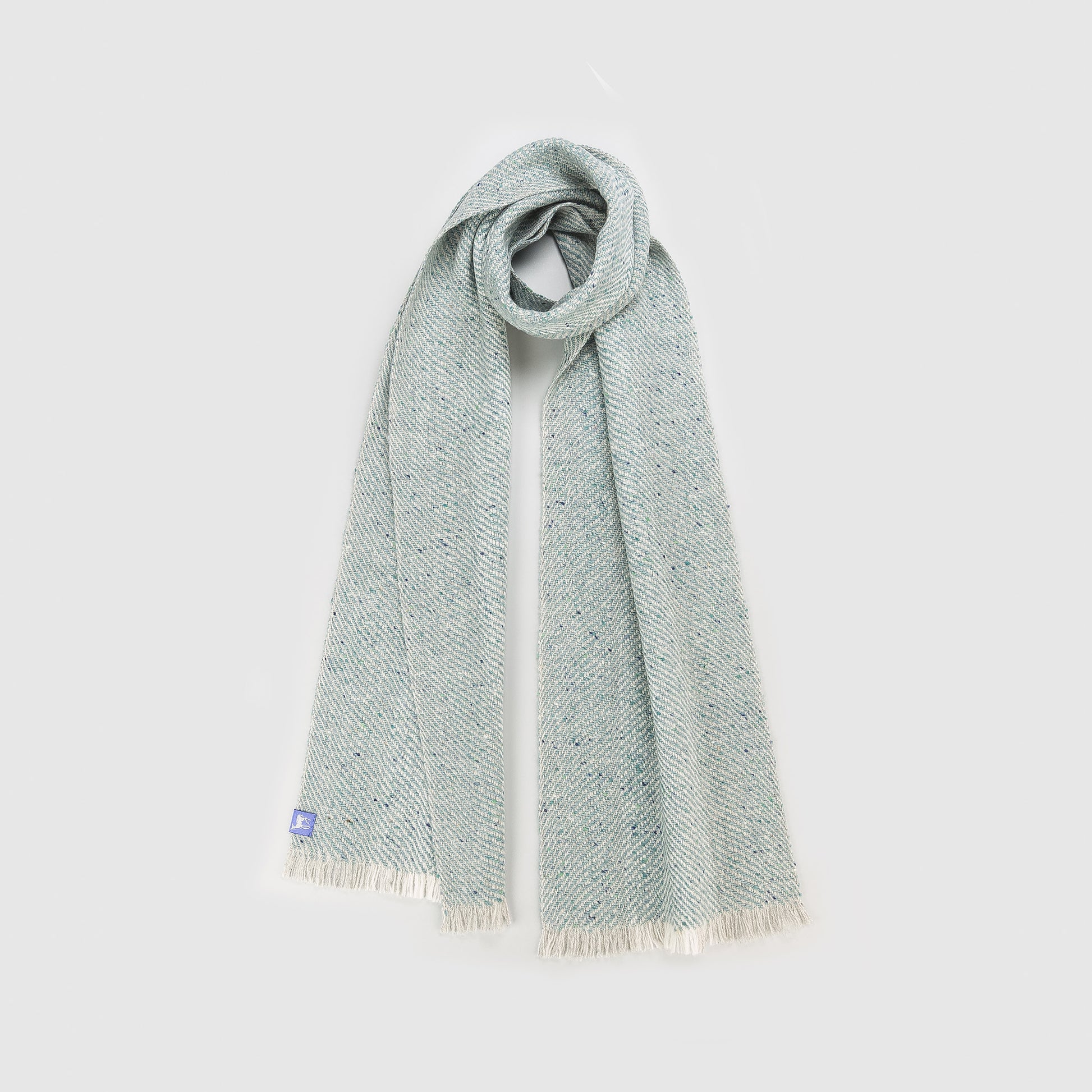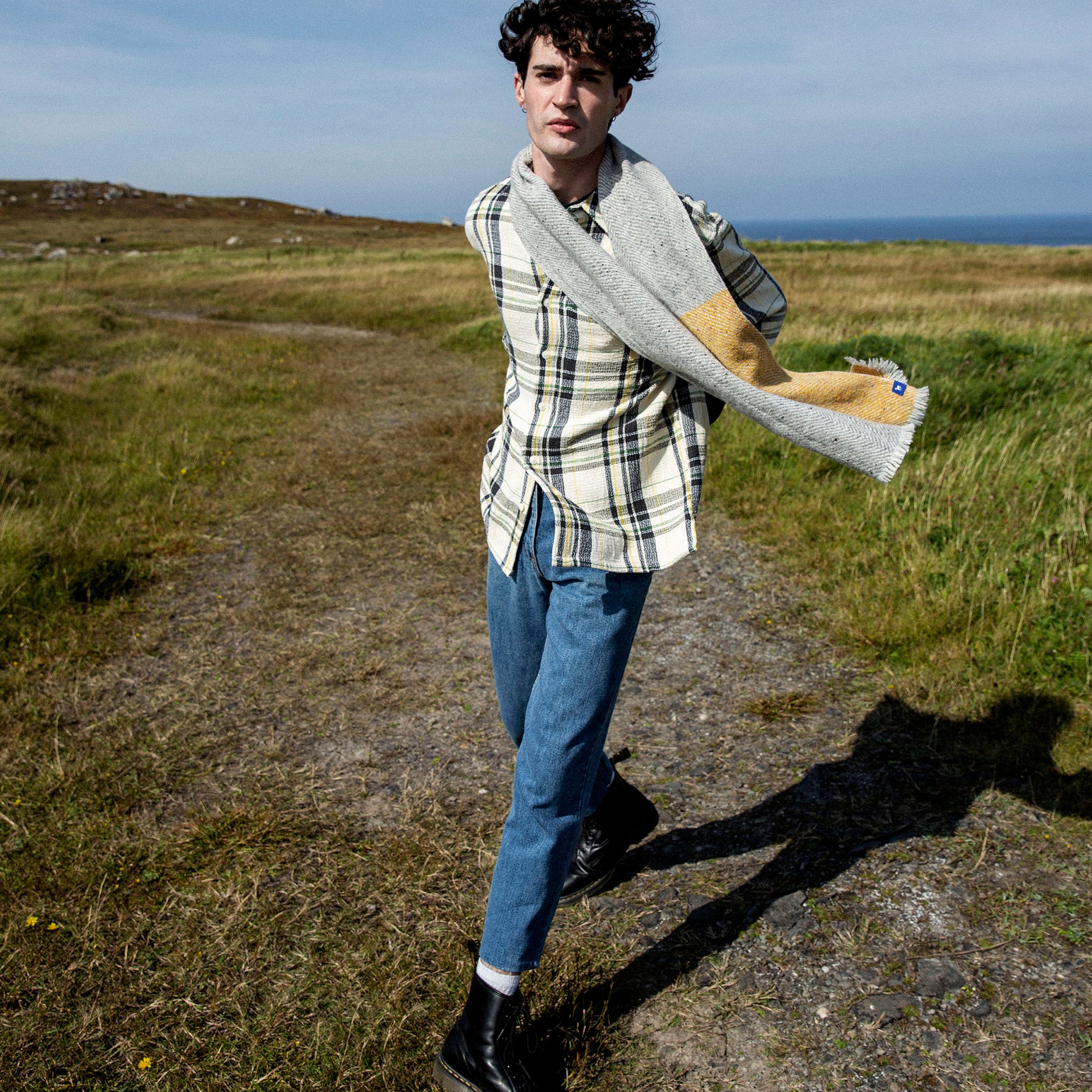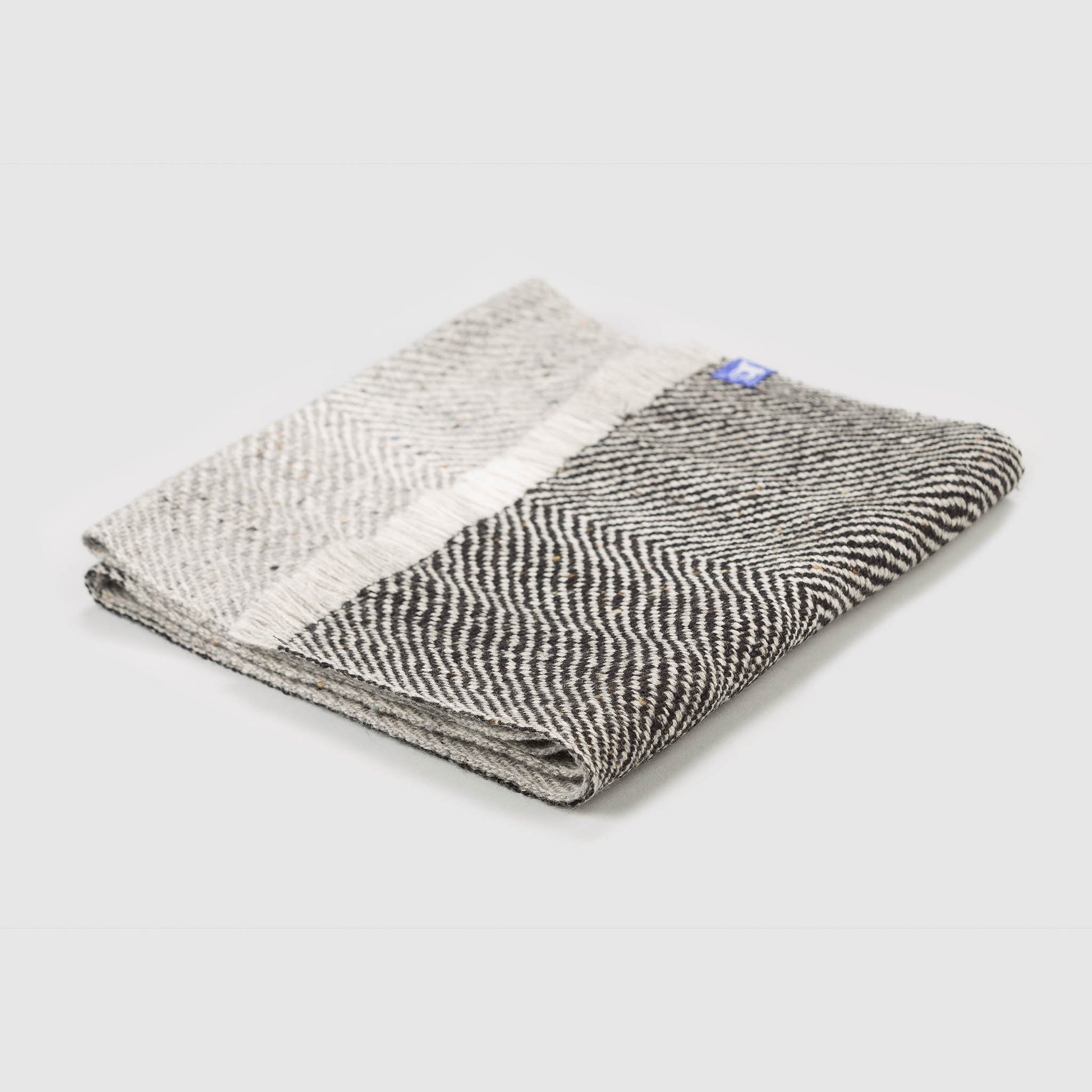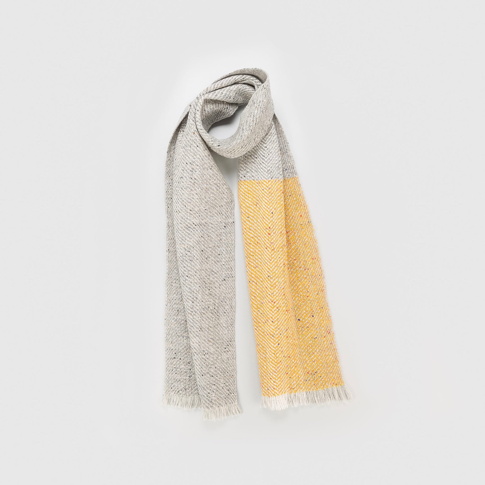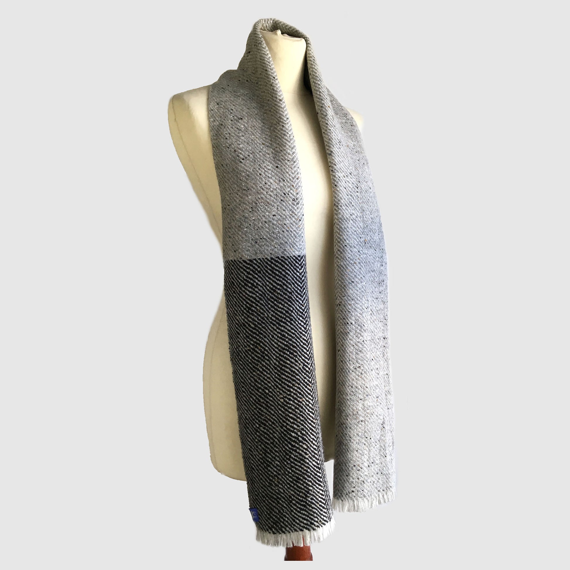 'Cloch agus carraig' 100% Supersoft Merino (Donegal fleck & lambswool) scarf woven in an undulating twill. Inspired by grey and black lines and tones running through the scattered rocks and stones around beaches of Slea Head.
