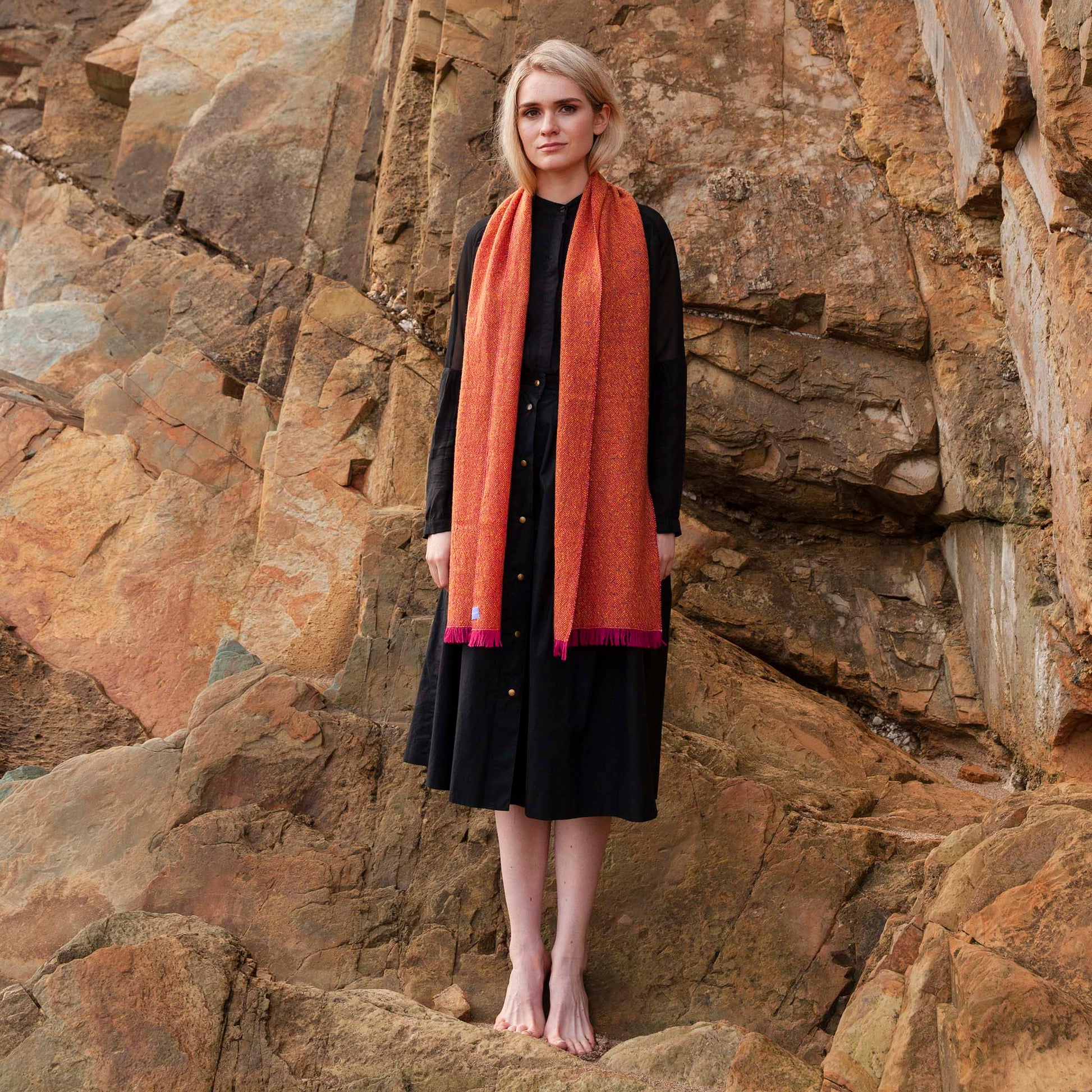 This design was inspired by vibrant wild flowers of the Dingle Peninsula. The flecks in the fabric are like the random specks of colour spread across the bushes. It is a modern take on a traditional tweed fabric and has the look of being roughly textured but is surprisingly super soft.